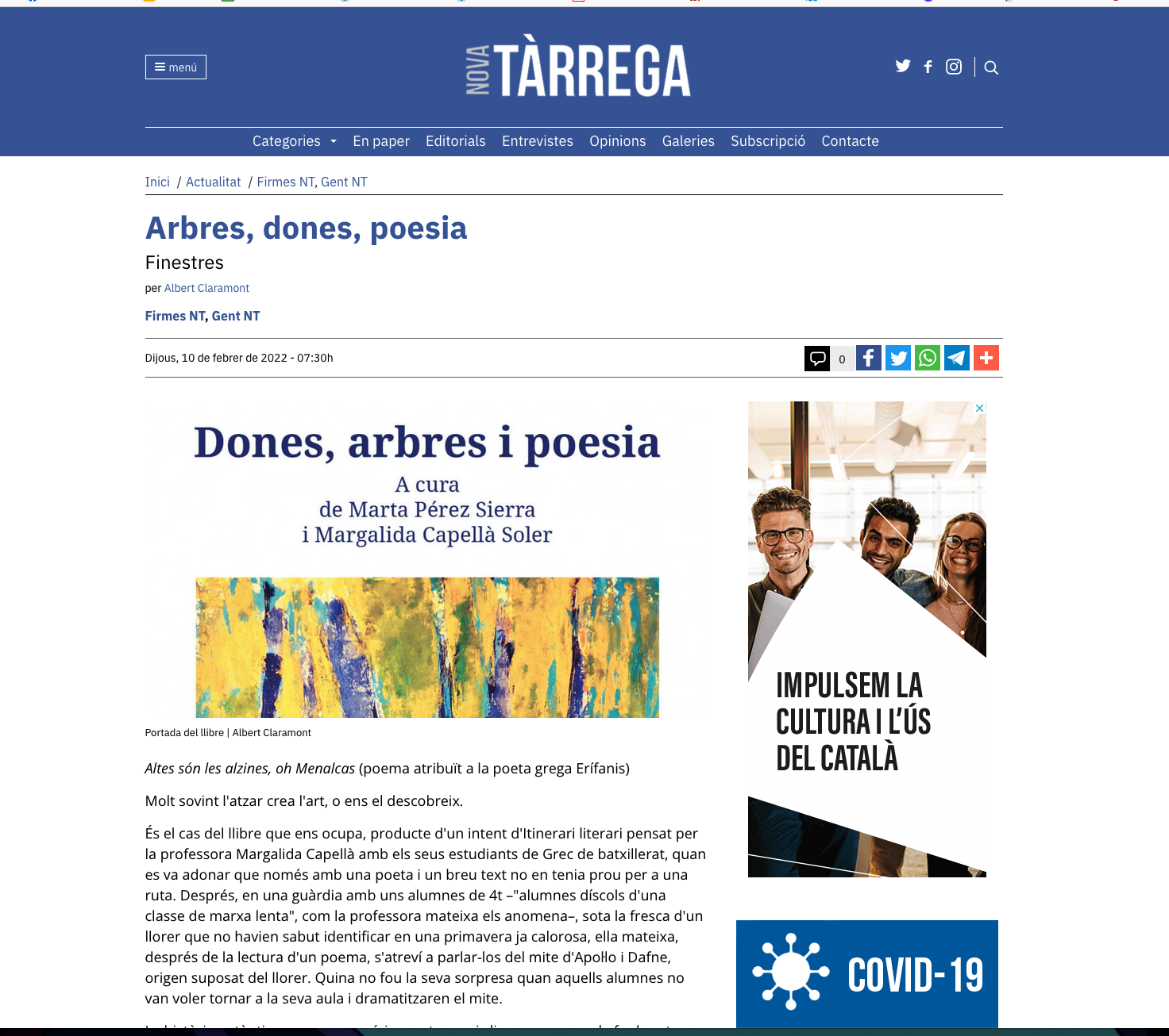 Albert Claramont a «Finestres» del diari «Nova Tàrrega» ressenya Dones, arbres i poesia (Voliana Edicions, 2021)