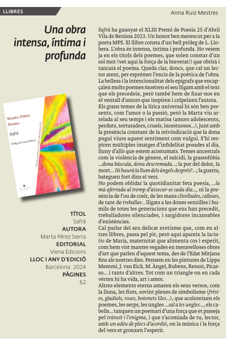 Anna Ruiz Mestres ressenya Safrà8 noviembre, 2024|By: Marta Pérez Sierra Anna Ruiz Mestres, professora de literatura i crítica literària ressenya Safrà (Viena Edicions, 2024) Tweet