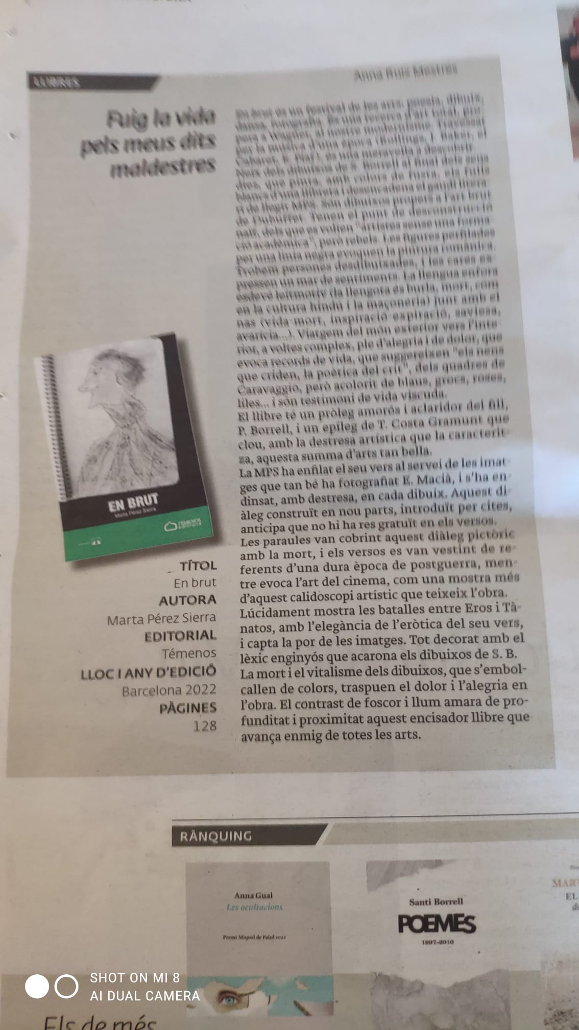 La crítica literària Anna Ruiz Mestres ressenya En brut (Témenos Edicions, 2022) al diari de Vilafranca 3 de vuit. Trobem persones desdibuixades, sovint sense coll, amb cares alegres i tràgiques, cossos sense forma, on hi ressalten les cames, i on les cares expressen un mar de sentiments. La llengua enfora esdevé leitmotiv (la llengota és …