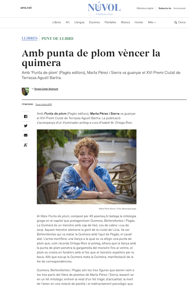 Gràcies, Teresa Costa-Gramunt per aquest encertat article a Núvol, digital de cultura sobre el meu «Punta de plom» (Ed. Pagès, 2020) amb pròleg d’Isabel Ortega «…travessant el dolor, el silenci imposat i l’intent d’ofec de l’ànima, Filònoe assoleix de parlar a través dels poemes de Marta Pérez i Sierra escrits simbòlicament amb la punta de …