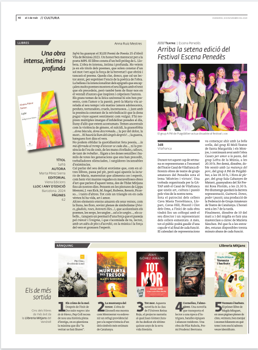 Ressenya de «Safrà», poemari de Marta Pérez Sierra ( Viena Edicions, 2024), obra guanyadora del XLIII Premi de Poesia «25 d’abril» Vila de Benissa 2023 al LLEGIR.CAT Fer click aquí per llegir-la Tweet