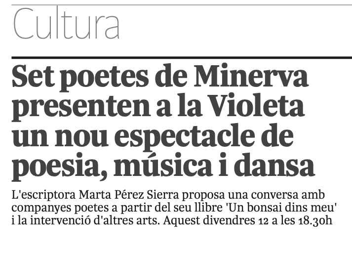El diari L’Independent de Gràcia parla de l’espectacle amb ball, poesia i música que vàrem fer a La Violeta el col·lectiu Minerva. els meus textos i poemes d’Un bonsai dins meu conversen amb poemes de les amigues poetes Minerva. També es fa ressò del premi obtingut amb el llibre de poemes Safrà. El «25 d’abril» …