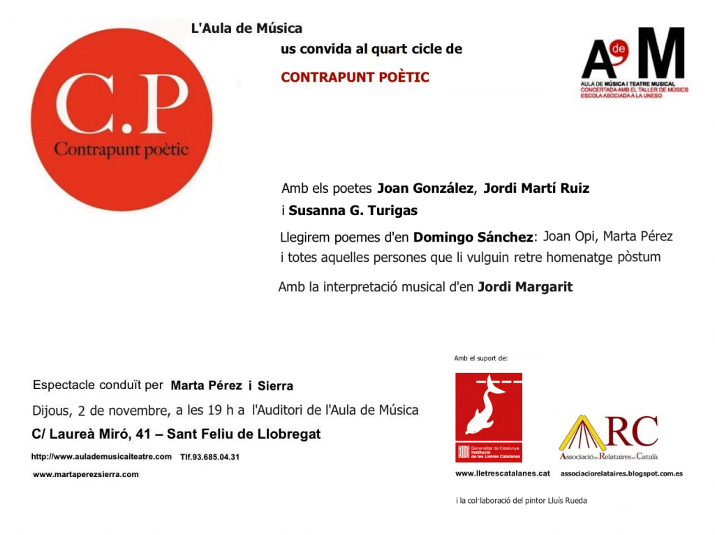 En Domingo Sanchez Castelló, el meu amic, el nostre estimat amic, ens ha deixat. Ell era un dels poetes convidats en aquest Contrapunt poètic de novembre. En honor seu Josep-Ramon Bach, Jordi Tena, Joan Opi, Susanna G. Turigas i la seva intima amiga Marga Homs, llegiren poemes seus. Els músics Jordi Margarit i Cristina Rabell li dedicaren llurs composicions. Gràcies!