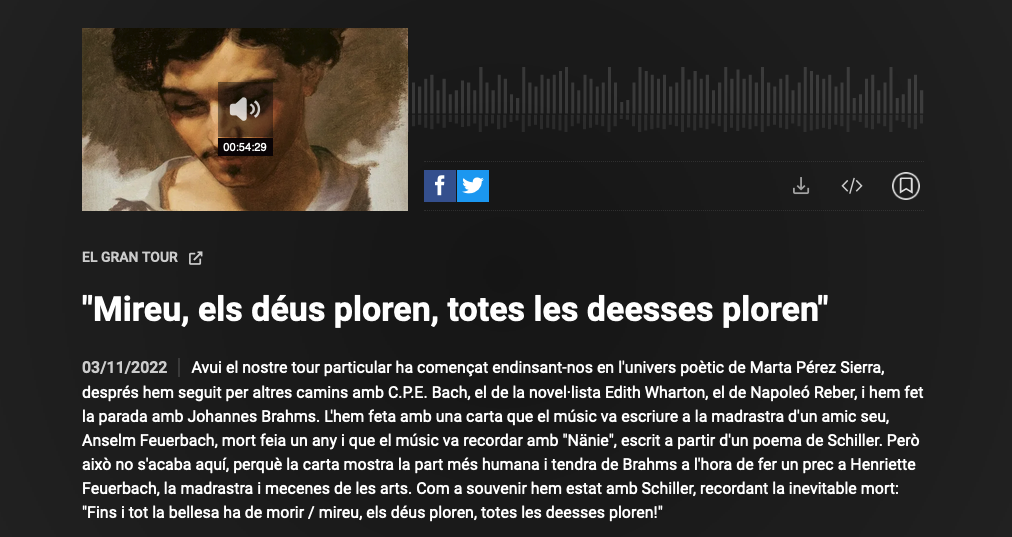 El gran tour 15 noviembre, 2022|By: Marta Pérez Sierra Victòria Palma en el programa El Gran Tour a Catalunya Música comença amb un poema el camí musical que ens proposa. En aquest programa del 3 de novembre de 2022, he d’agrair-li que triés un poema del meu llibre Llavors, els peixos Tweet