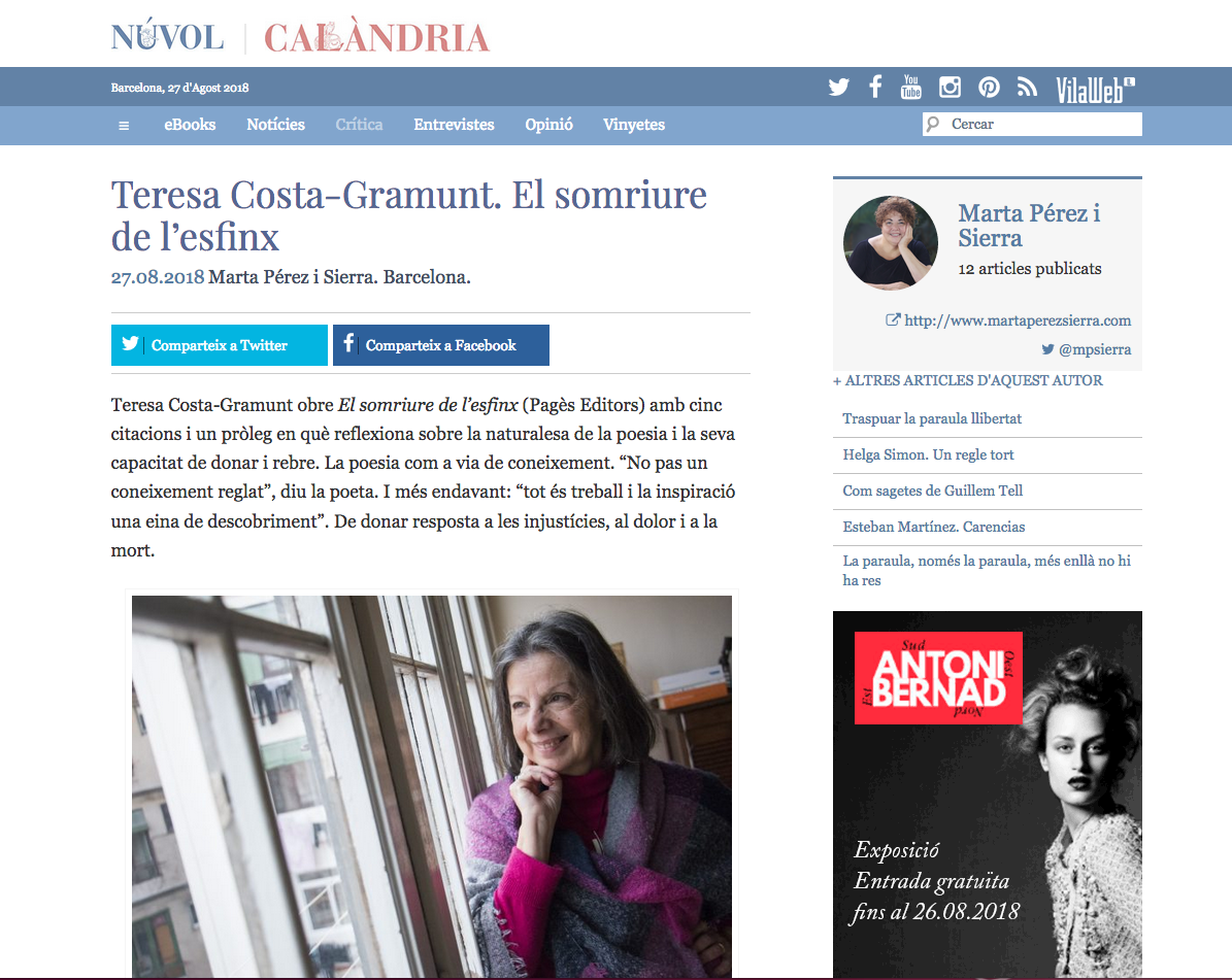 Núvol.com, el diari digital de cultura, publica la ressenya que he escrit del llibre «El somriure de l’esfinx» de Teresa Costa-Gramunt. Gràcies, Núvol! Per llegir-la feu clic aquí.