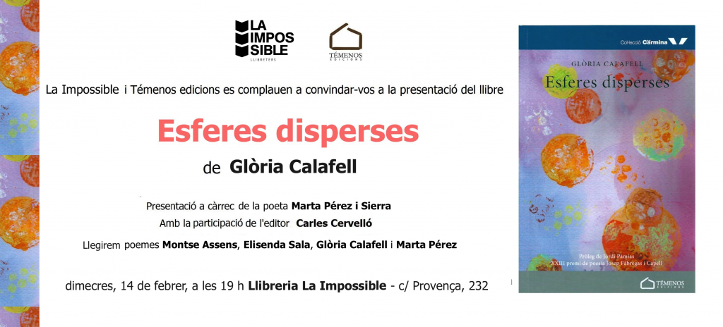 Glòria Calafell presenta el seu últim poemari Esferes disperses (Témenos edicions, 2017) XXIII Premi de Poesia Josep Fàbregas i Capell de Sallent. Amb un pròleg del poeta Jordi Pàmias.