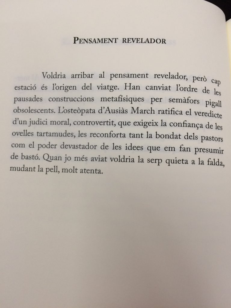 Insòlit és la paraula justa: molts poemes realment són insòlits, imatges i símbols absurds que configuren un espai fulminant on el lector segur que es revolta i alhora s’admira.