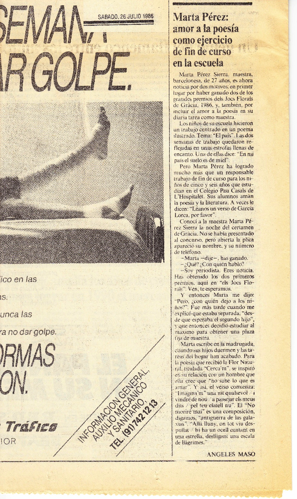 Vaig retornar al carrer Bailen quan em vaig separar. Un vespre, l’Adrià i l’Agustí ja dormien, va sonar el telèfon per comunicar-me que havia guanyat «La Flor Natural» i «La Viola» als Jocs Florals de Gràcia. Era la primavera de l’any 1986. Tenia 29 anys.