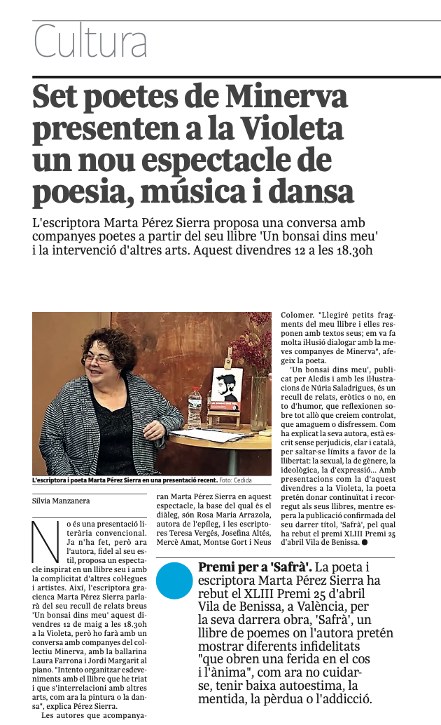 El diari L’Independent de Gràcia parla de l’espectacle amb ball, poesia i música que vàrem fer a La Violeta el col·lectiu Minerva. els meus textos i poemes d’Un bonsai dins meu conversen amb poemes de les amigues poetes Minerva.