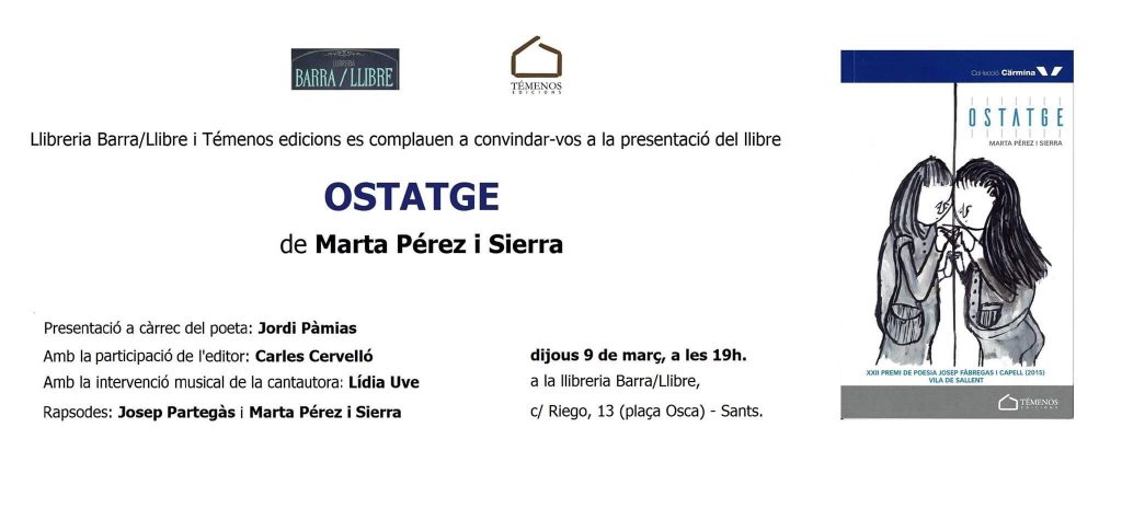 Va ser molt emocionant presentar per primer cop Ostatge rodejada de bons amics i a la llibreria Barra/Llibre. El poeta i amic Jordi Pàmias va presentar el llibre i l’editor Carles Cervelló va parlar del premi de Sallent i del que editar poesia és més un acte d’amor que lucratiu.