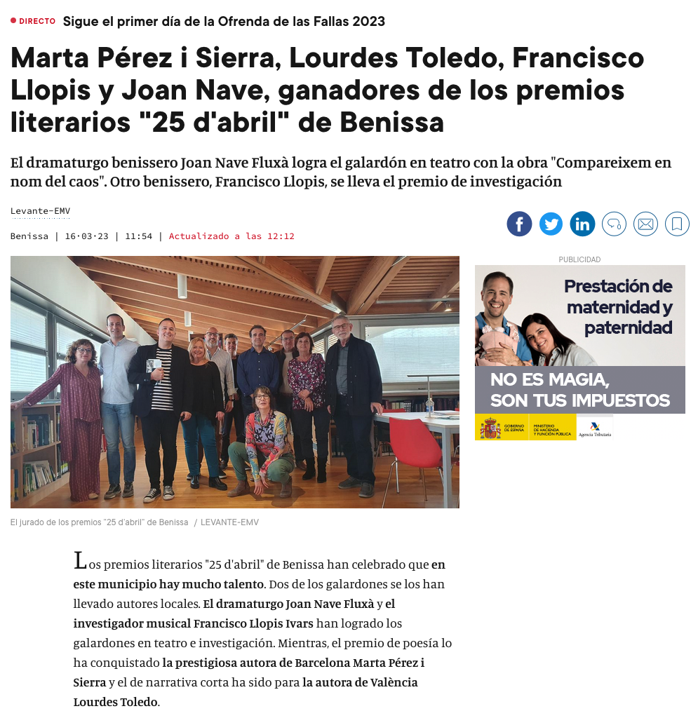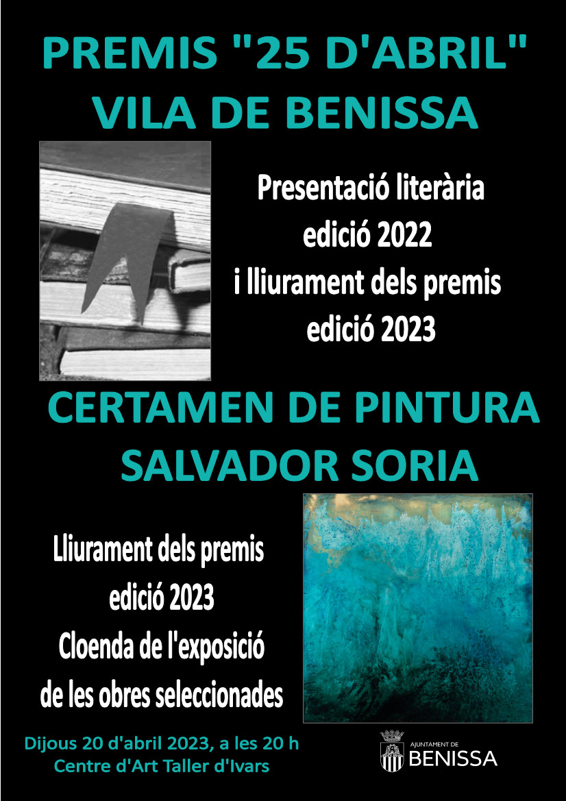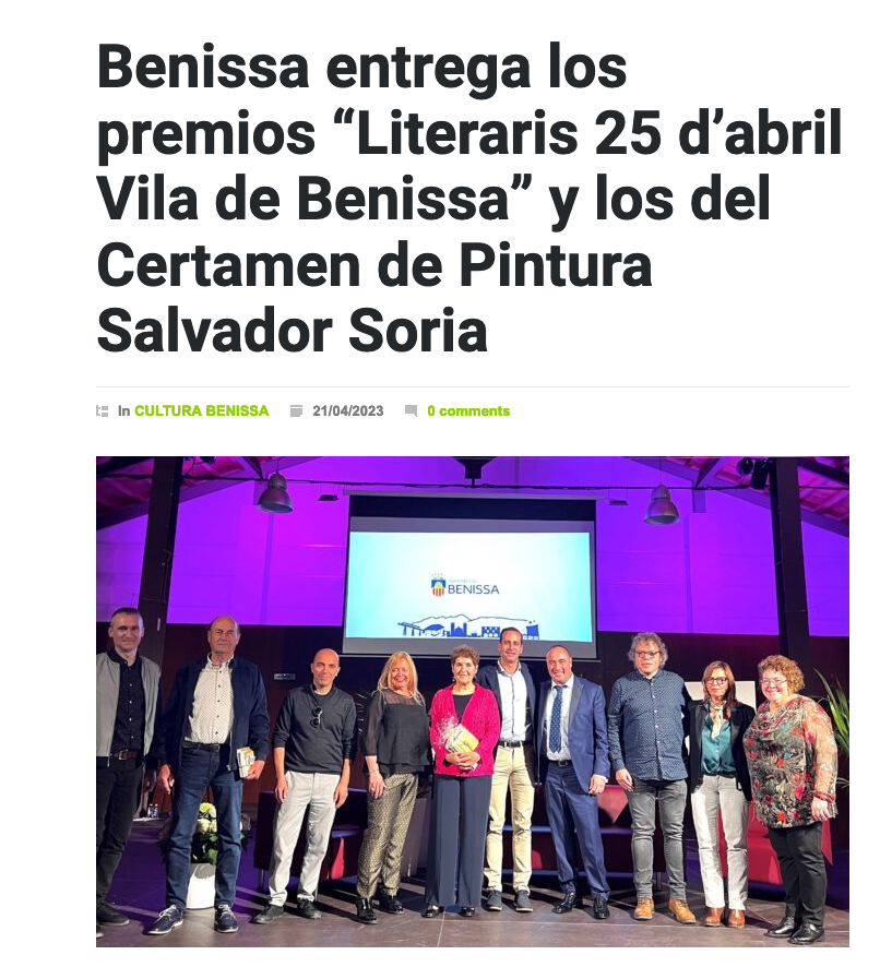 Al Centre d’Art Taller d’Ivars ens van atorgar els premis en una festa preciosa el 20 d’abril. Gràcies Ajuntament de Benissa! Gràcies Artur Poquet, alcalde, i Rosa Lucía Pino, regidora de cultura. Gràcies Marisa Ortolà, tècnica de cultura per estar atenta a tot i a totes les nostres necessitats.