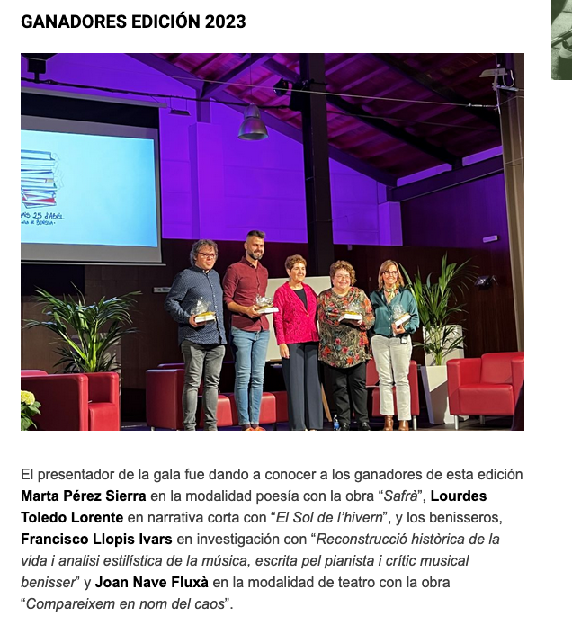 - Marta Pérez Sierra en la categoría de poesía por su obra «Safrà»