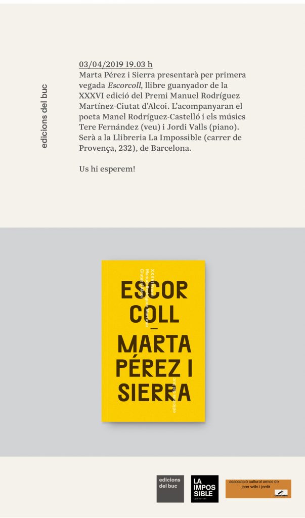 Dimecres, 3 d’abril, a les 19 hores, a la llibreria La Impossible de Barcelona, presentarem Escorcoll.