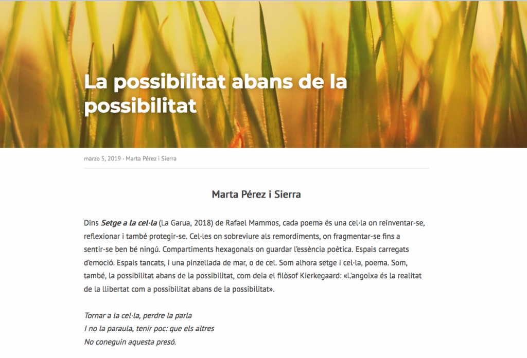 Rafa Mamos a La Quadern9 marzo, 2019|By: Marta Pérez Sierra La Revista Quadern publica la ressenya que vaig escriure per a Setge a la cel·la (Tanit, 2018) de Rafa Mammos. La podeu llegir si feu clic aquí Tweet Deja un comentarioDebes registrarte para dejar un comentario