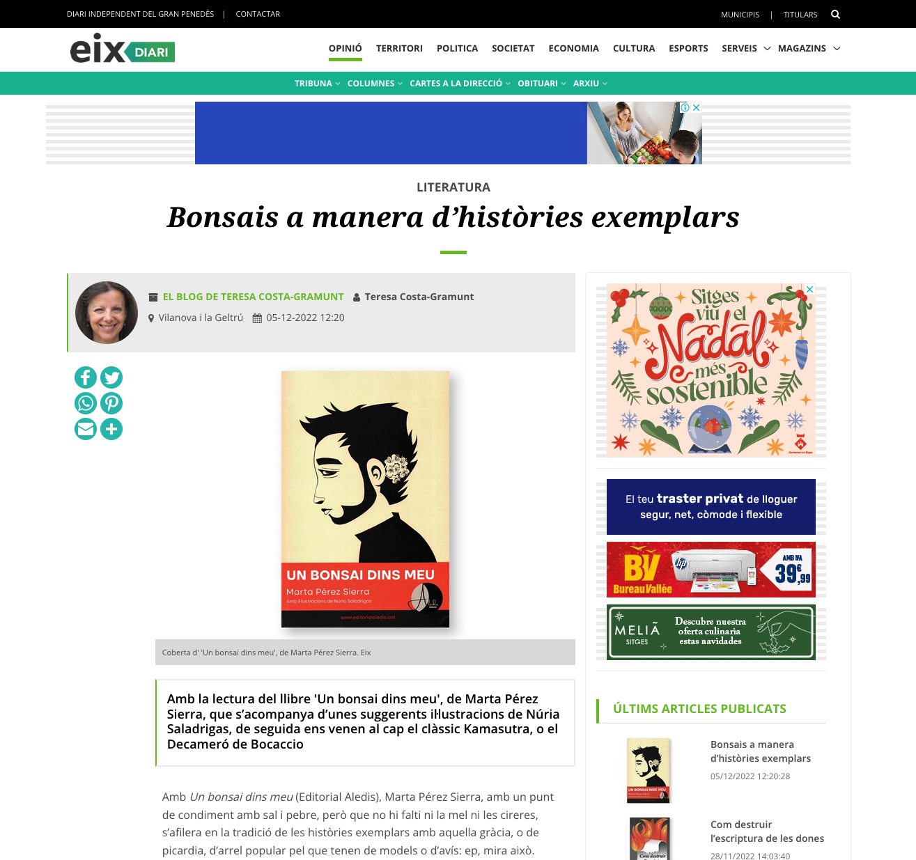 Teresa Costa-Gramunt ressenya «Un bonsai dins meu» 5 diciembre, 2022|By: Marta Pérez Sierra Teresa Costa-Gramunt ressenya «Un bonsai dins meu» a eix diari. Fes click aquí per llegir-la. Tweet