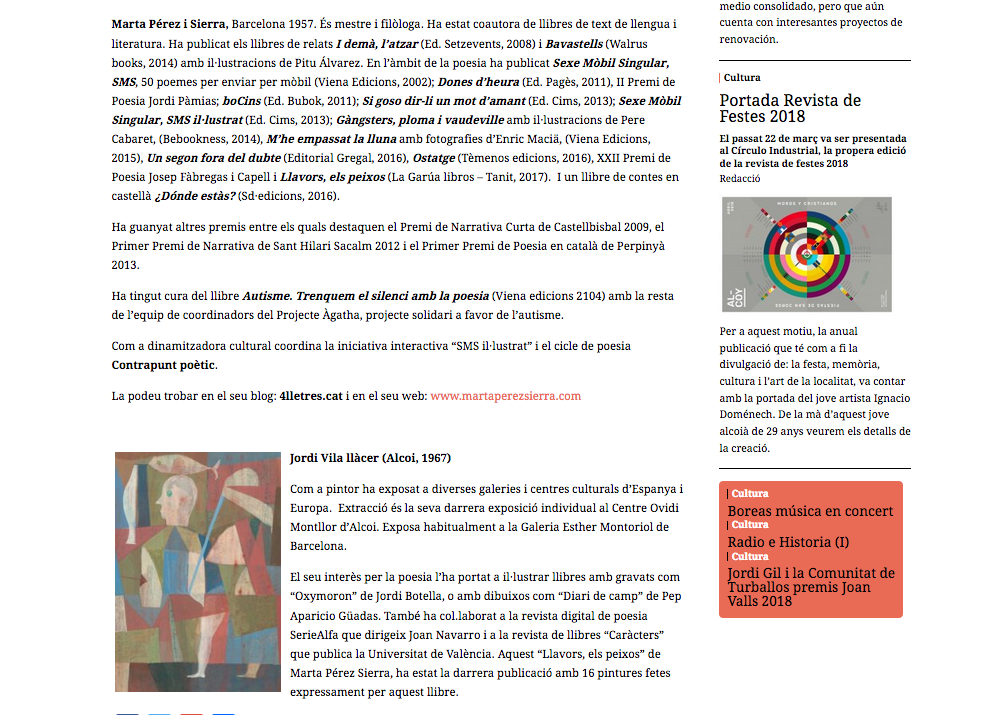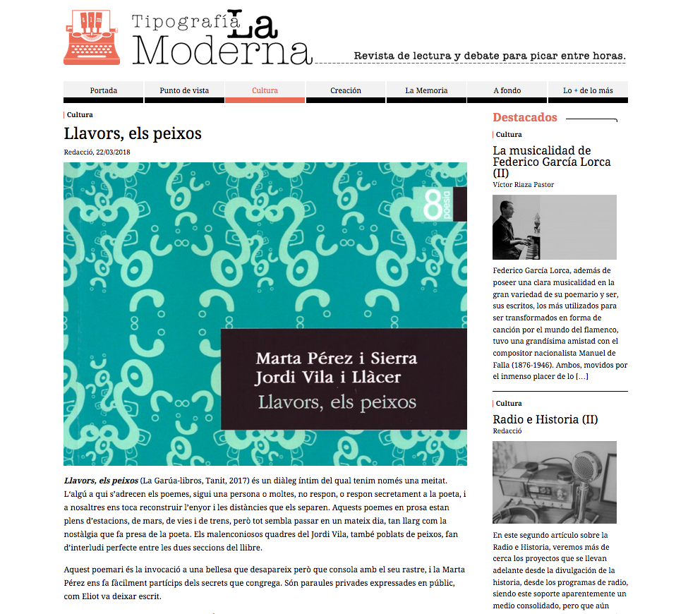 Quan en Jordi Vila Llàcer i jo vam presentar a Alcoi Llavors, els peixos, la revista de lectura «para picar entre horas» Tipografía La Moderna va publicar aquesta breu ressenya. Gràcies! Ho podeu llegir si feu clic aquí