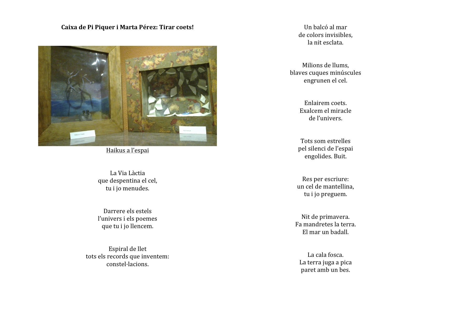 Una caixa amb Pi Piquer 5 agosto, 2013|By: Marta Pérez Sierra Haikus a l’espai Tweet Deja un comentario Debes registrarte para dejar un comentario