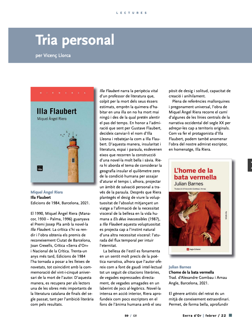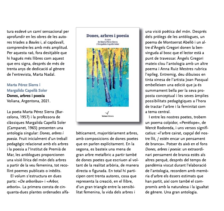 Vicenç Llorca ressenya «Dones, arbres i poesia» 31 enero, 2022|By: Marta Pérez Sierra Vicenç Llorca recomana a «Tria personal» de la revista Serra d’or (febrer, 2022) el llibre Dones, arbres i poesia (Voliana Edicions, 2021) del que som curadores la Margalida Capellà i jo. Moltíssimes gràcies, Vicenç! Tweet