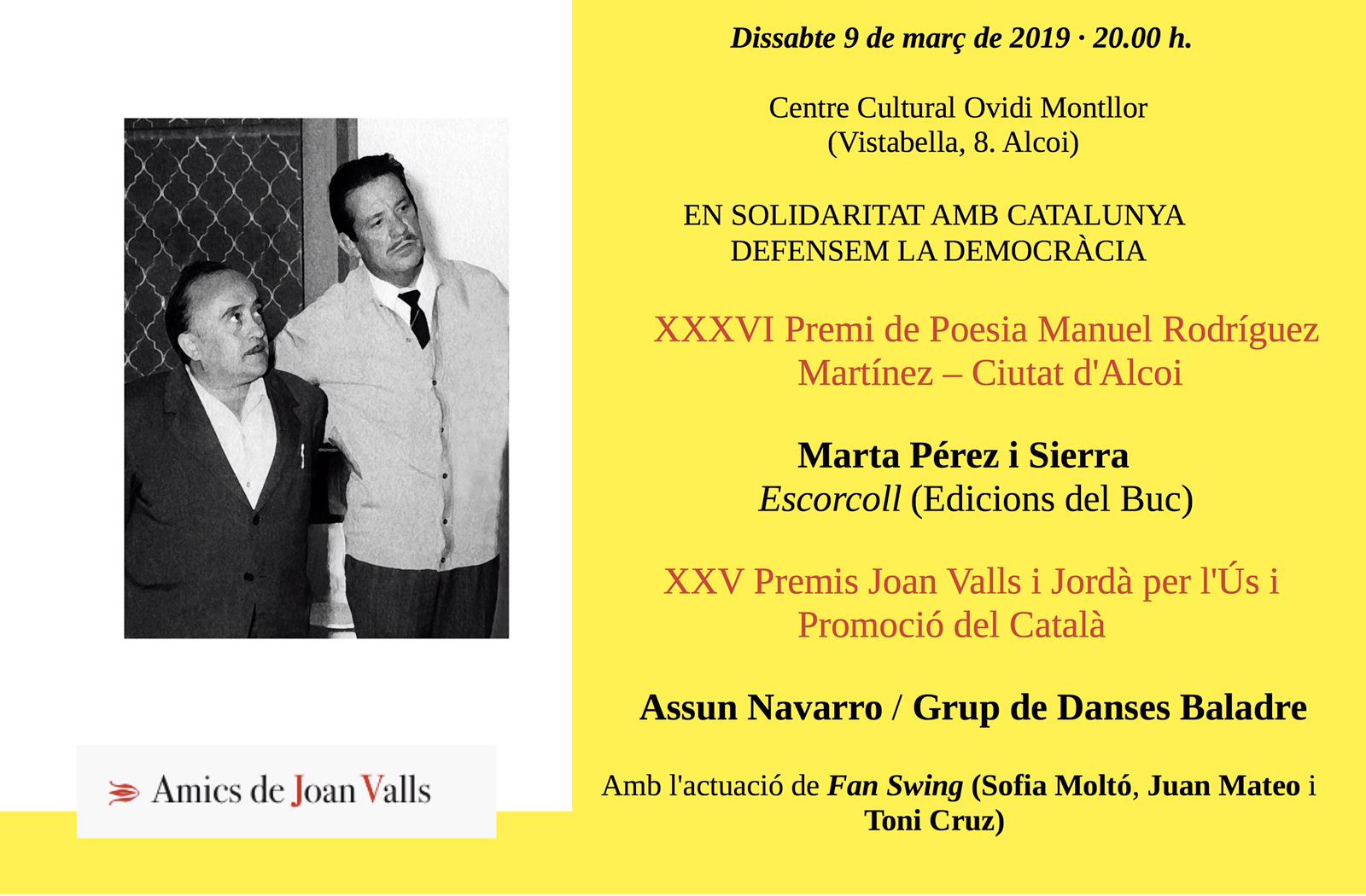 L’associació cultural Amics de Joan Valls em concedeix el XXXVI Premi de Poesia Manuel Rodríguez Martínez – Ciutat d’Alcoi. En el seu blog publiquen: